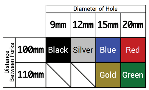 Step 2: measure the distance between the holes on your fork - it will be either 100mm or 110mm. Now purchase the HUSKE Plugs that match your measurements. There’s a color coded chart below that will help you make sure you’re buying the right set.